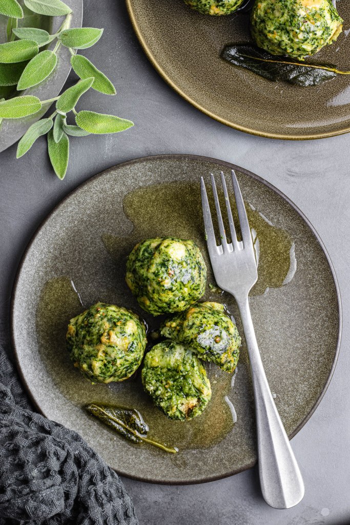 Cuocere i canederli in acqua bollente salata, per 5′ da quando vengono a galla, quindi tuffarli nel burro, fuso insieme alle foglie di salvia. Far saltare i canederli per 2′ nella padella del condimento, di modo che si dorino appena. Servire con una spolverata di formaggio grattugiato.