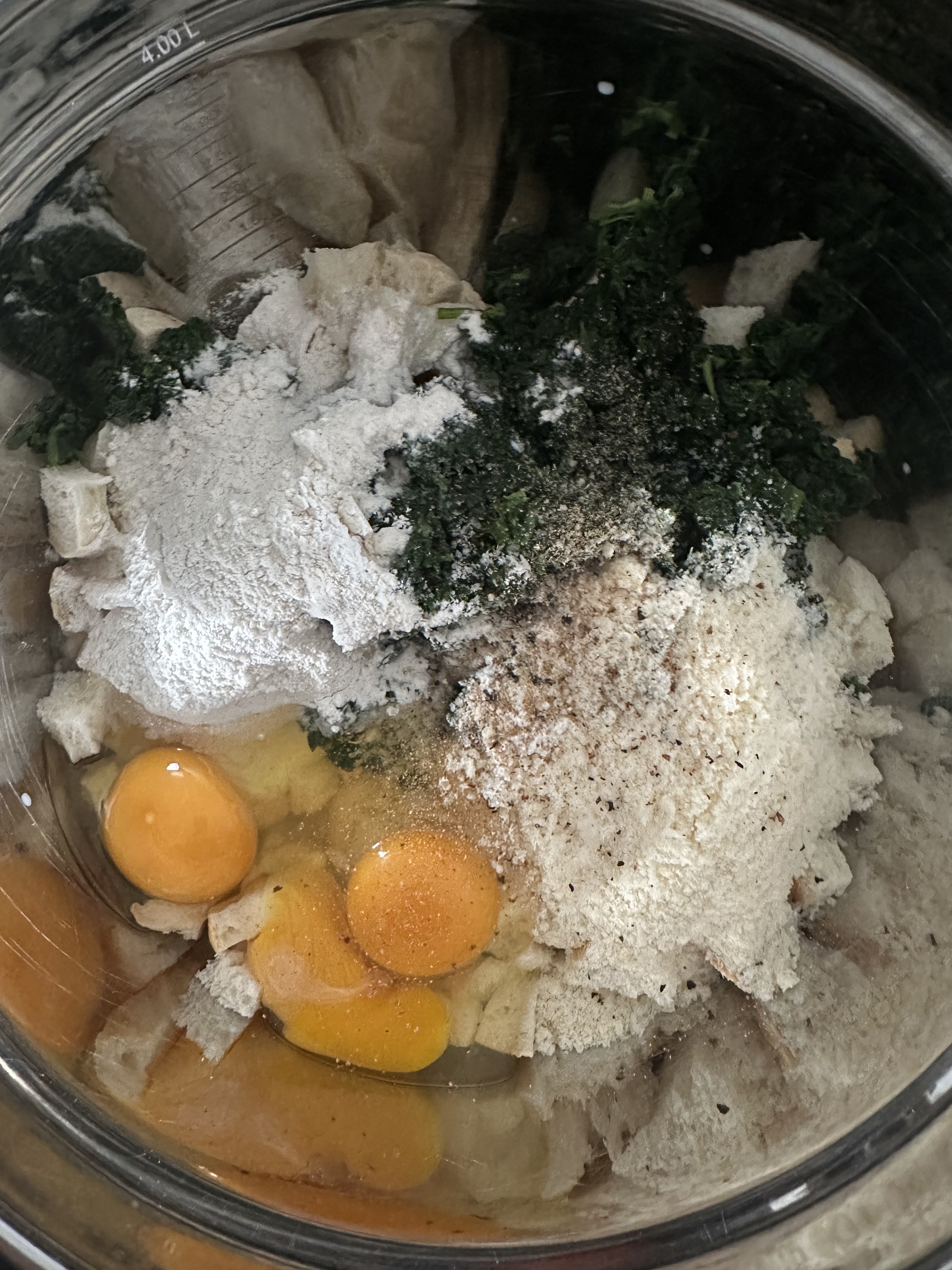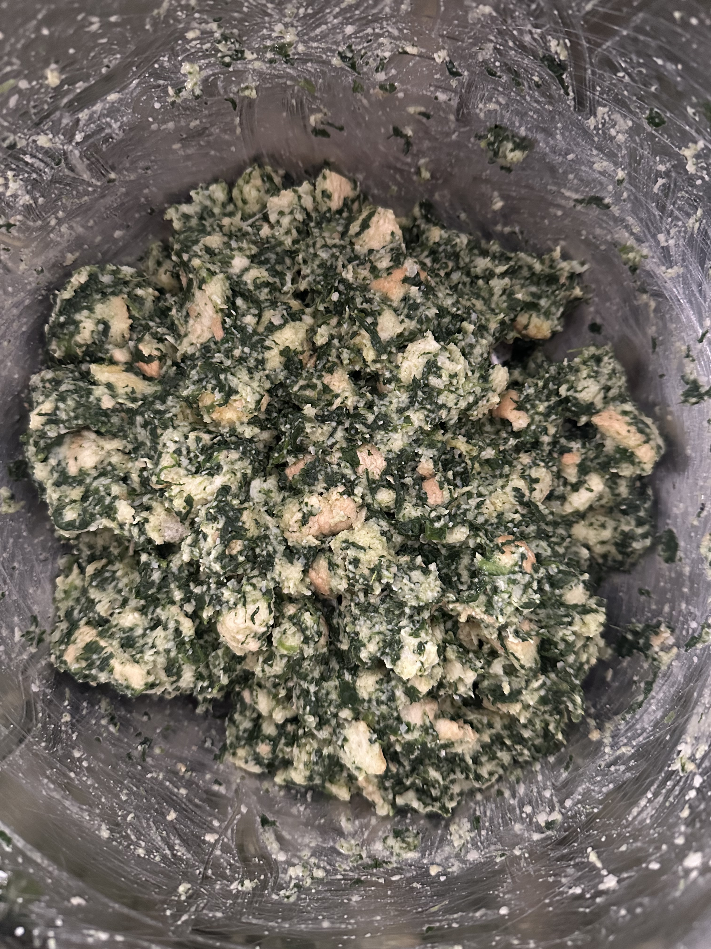 Far bollire gli spinaci per 4-5′, quindi scolarli, farli raffreddare completamente e strizzarli benissimo, tritarli finemente a coltello. Tagliare il pane a cubetti, disporlo in una ciotola capiente ed aggiungervi gli spinaci, le uova, il latte, il formaggio, la farina, una generosa grattata di noce moscata, una macinata di pepe e poco sale (grazie alla sapidità del formaggio non ne richiede molto). Mescolare a mano, impastando con vigore di modo che il pane assorba bene i liquidi, ottenendo un composto appiccicoso ma tenace. Coprire la ciotola con pellicola e far riposare a temperatura ambiente per 30-40′.
