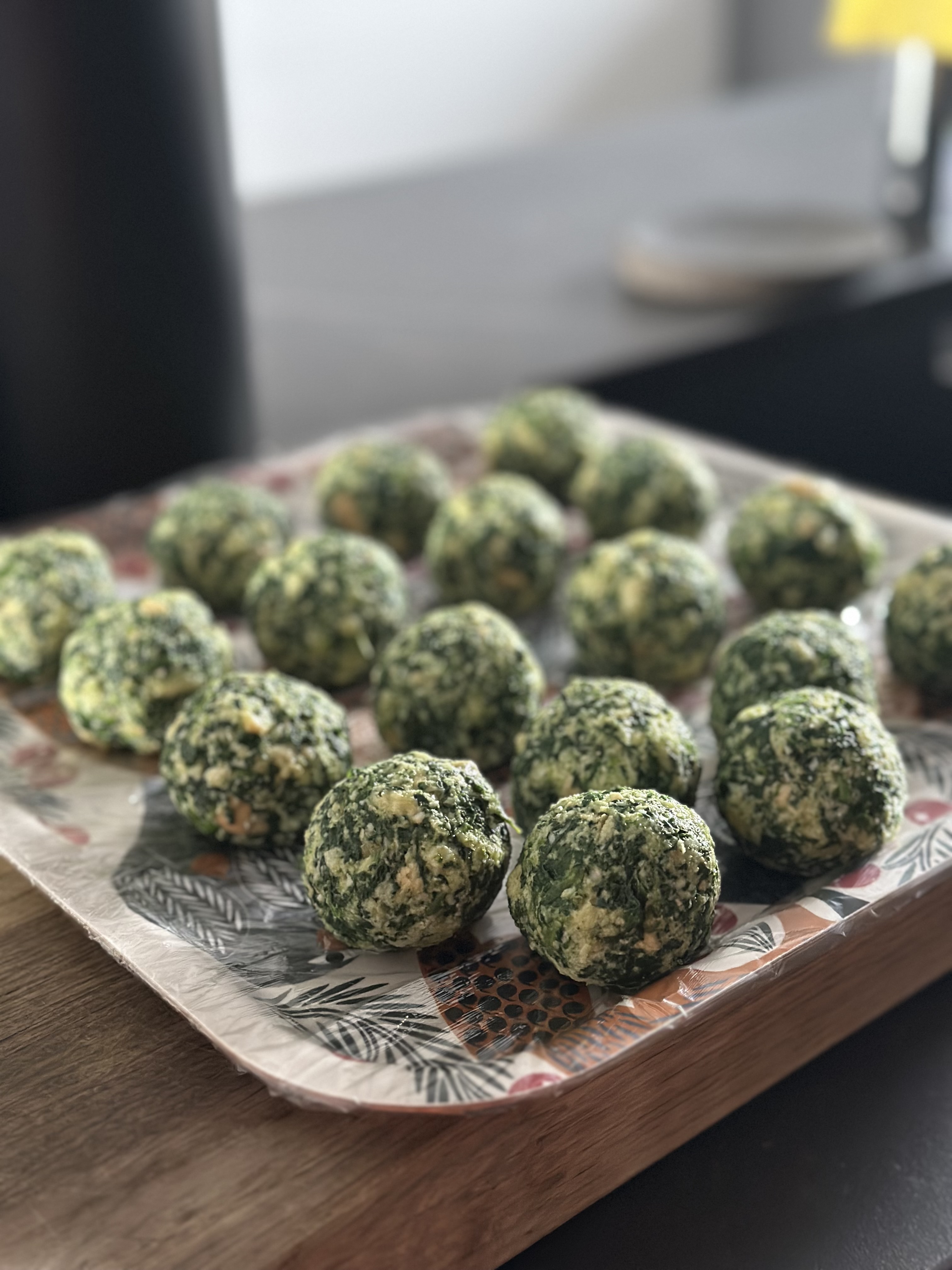Prelevare piccole quantità di impasto e lavorarle fra le mani (il composto sarà compatto e ben lavorabile) dandogli forma tonda: la dimensione varia a piacere, ma per questa tipologia di canederli vi consiglio di non farli eccessivamente grandi, di modo che si condiscano meglio. Io ho ottenuto circa 16 canederli, delle dimensioni appena più grandi di una pallina da ping pong.