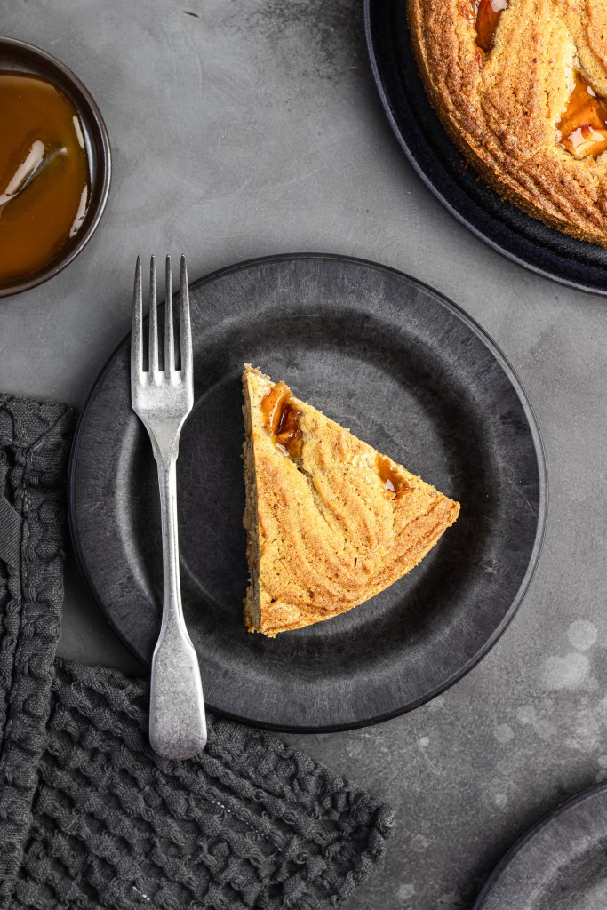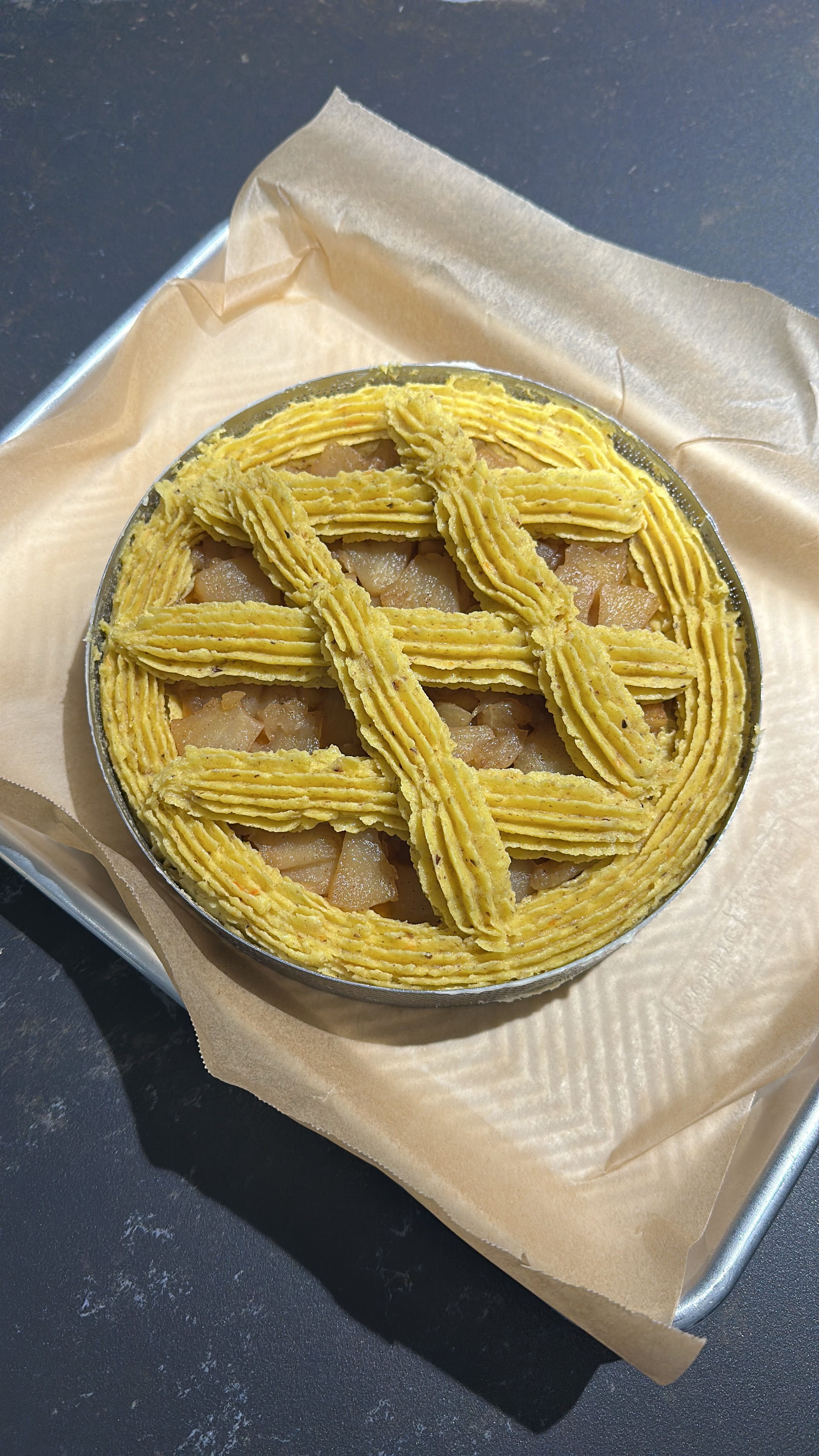 Una deliziosa crostata di frolla montata alle noci, ripiena di confettura di albicocche e mele. Il dolce che vi convincerà dal primo morso.