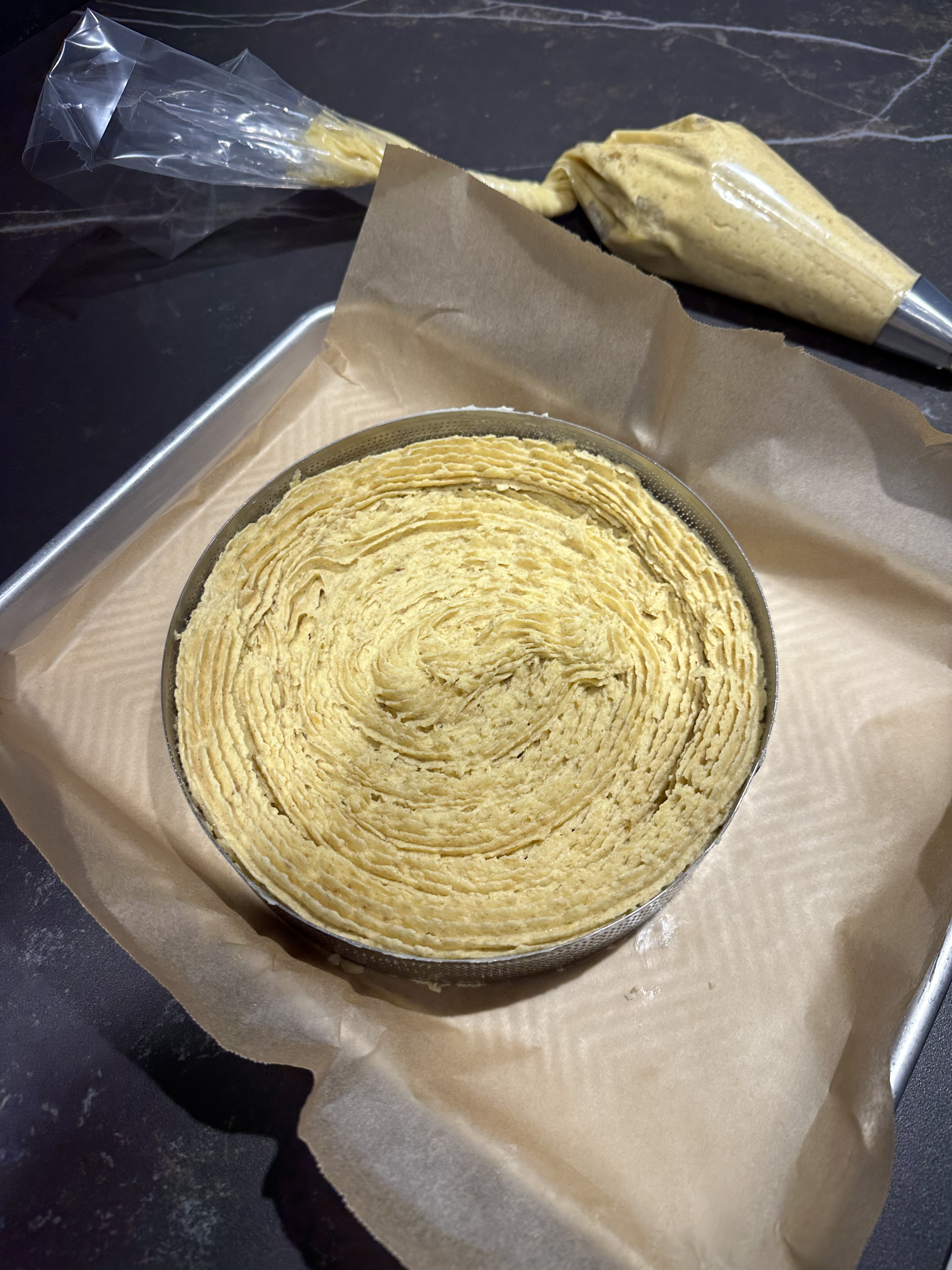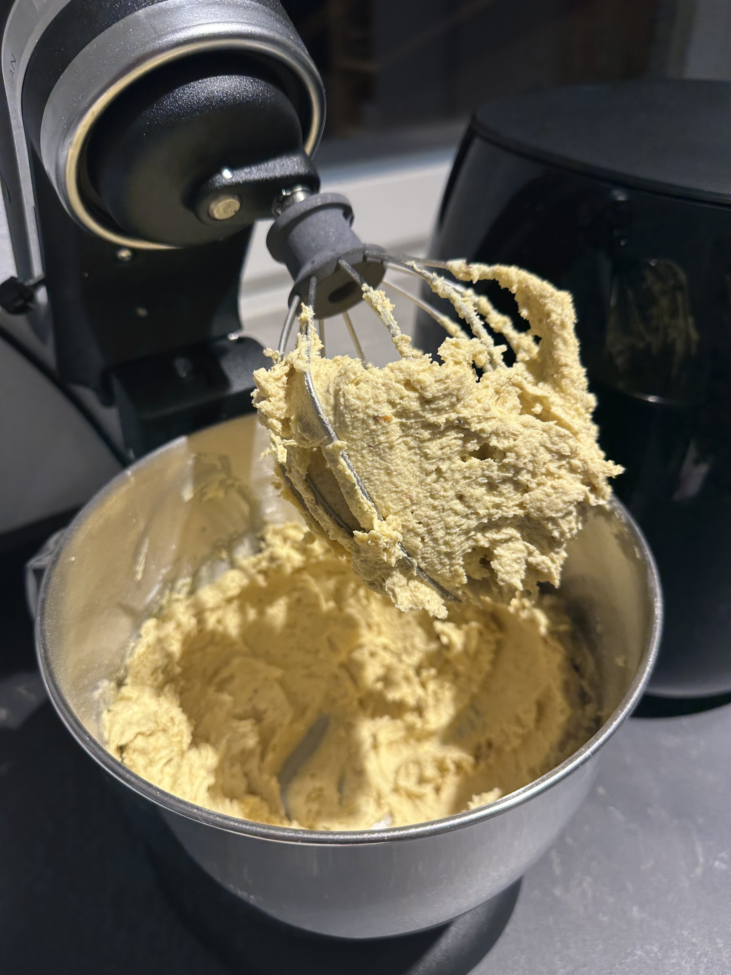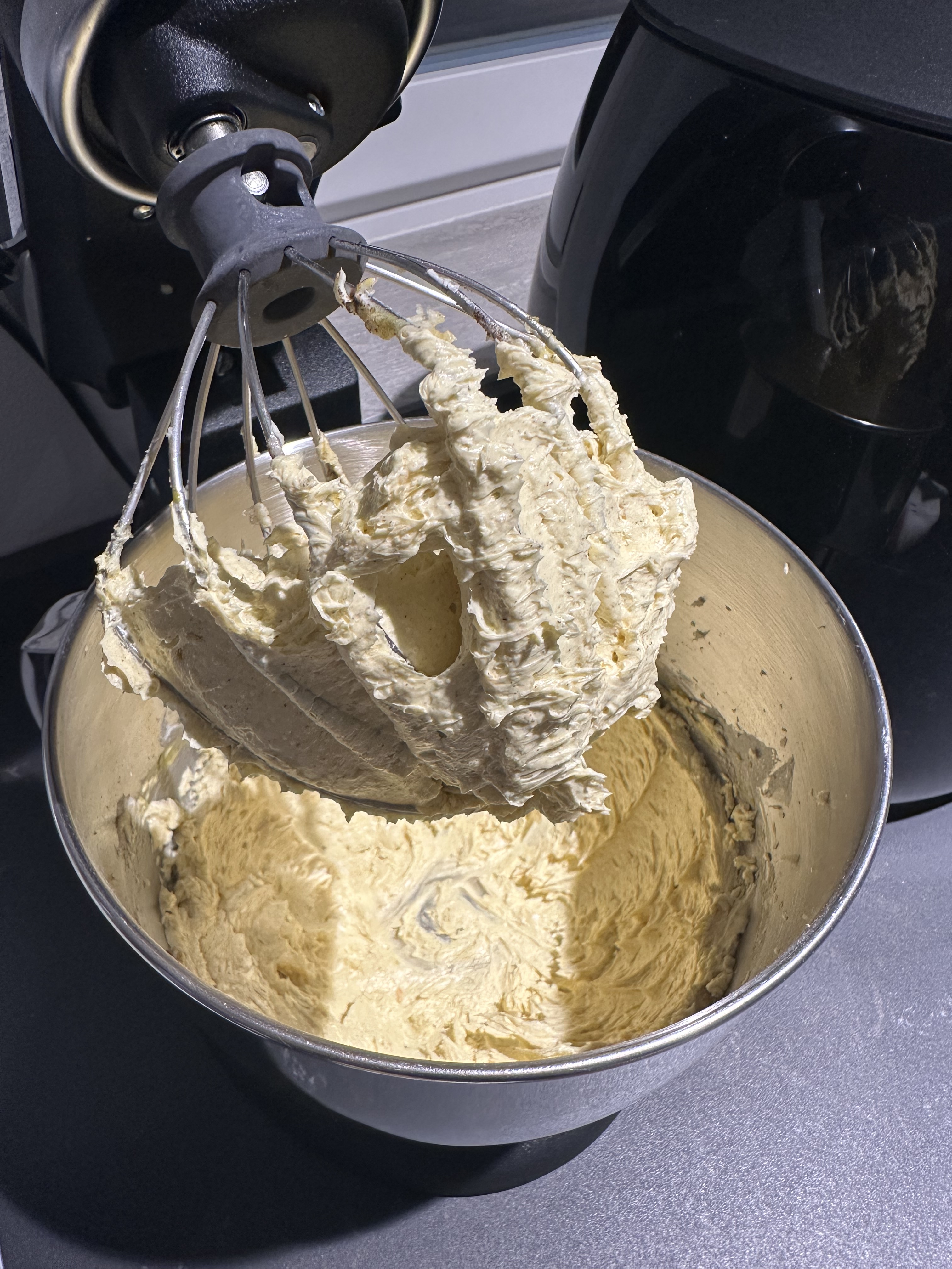 Per la frolla montata alle noci: tritare finemente le noci in un robot da cucina o food processor (io prima le tosto per 2-3′ in una padella antiaderente su fiamma dolce). Nella ciotola della planetaria inserire il burro a temperatura ambiente (deve avere una consistenza spatolabile), lo zucchero a velo, il sale, i semi di vaniglia e la scorza di limone. Montare con le fruste per 6-7′, finché il burro non sarà chiaro e spumoso (foto 1). Sempre montando, a velocità sostenuta, aggiungere le uova, in 2-3 volte, facendo ben assorbire una dose prima di aggiungere la successiva (foto 2): il composto non deve stracciarsi, ma restare uniforme, altrimenti significa che gli ingredienti non erano a temperatura ambiente ed il burro non era montato a sufficienza. Aggiungere infine le noci tritate, la farina ed il lievito setacciati. Mescolare brevemente, giusto il tempo di amalgamare il tutto. Spostare subito il composto in una tasca da pasticcere dotata di bocchetta a stella del diametro di 1 cm.
