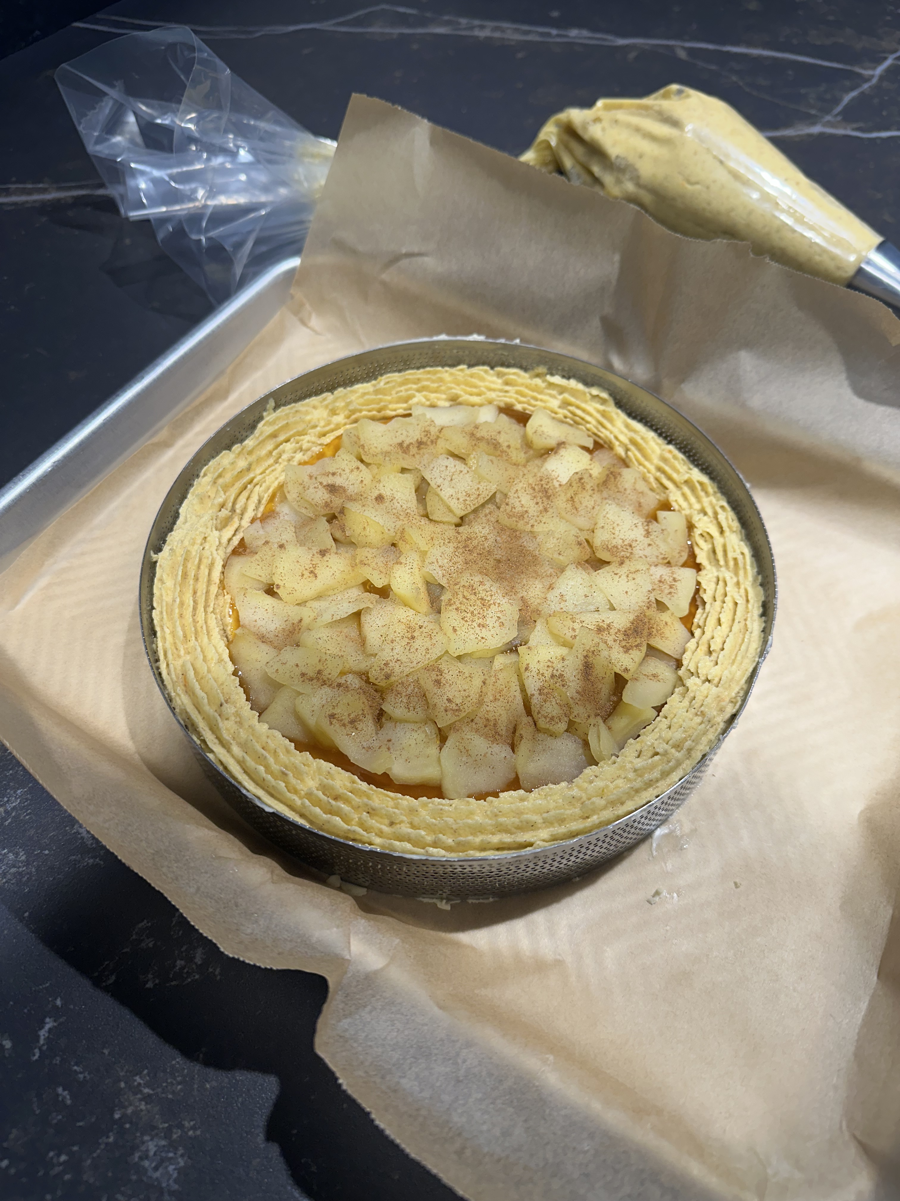 Imburrare (senza infarinare) un anello microforato per crostate e posizionarlo su una teglia foderata con carta forno (foto 3), come faccio io, oppure imburrare uno stampo da forno antiaderente con pareti lisce. Con la tasca da pasticcere dressare la frolla montata su tutto il fondo. Dressare un cerchio anche lungo tutto il bordo, di modo che venga sopraelevato rispetto al fondo (foto 4). Distribuire sulla base la confettura di albicocche, quindi sopra le mele (foto 5). Con la frolla montata restante dressare dei decori sulla superficie (foto 6). Spostare in frigorifero per circa 1h prima della cottura.