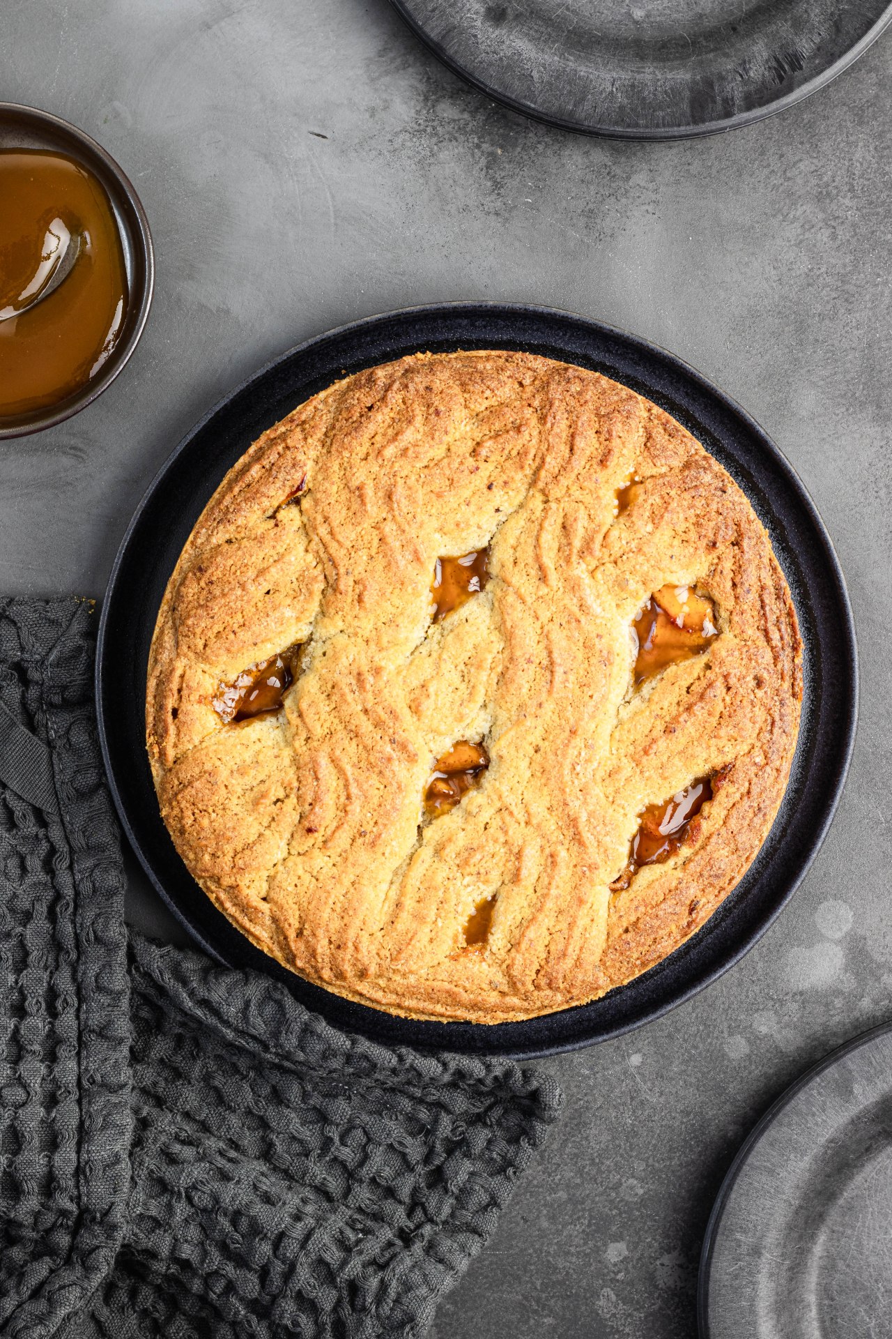 Una deliziosa crostata di frolla montata alle noci, ripiena di confettura di albicocche e mele. Il dolce che vi convincerà dal primo morso.